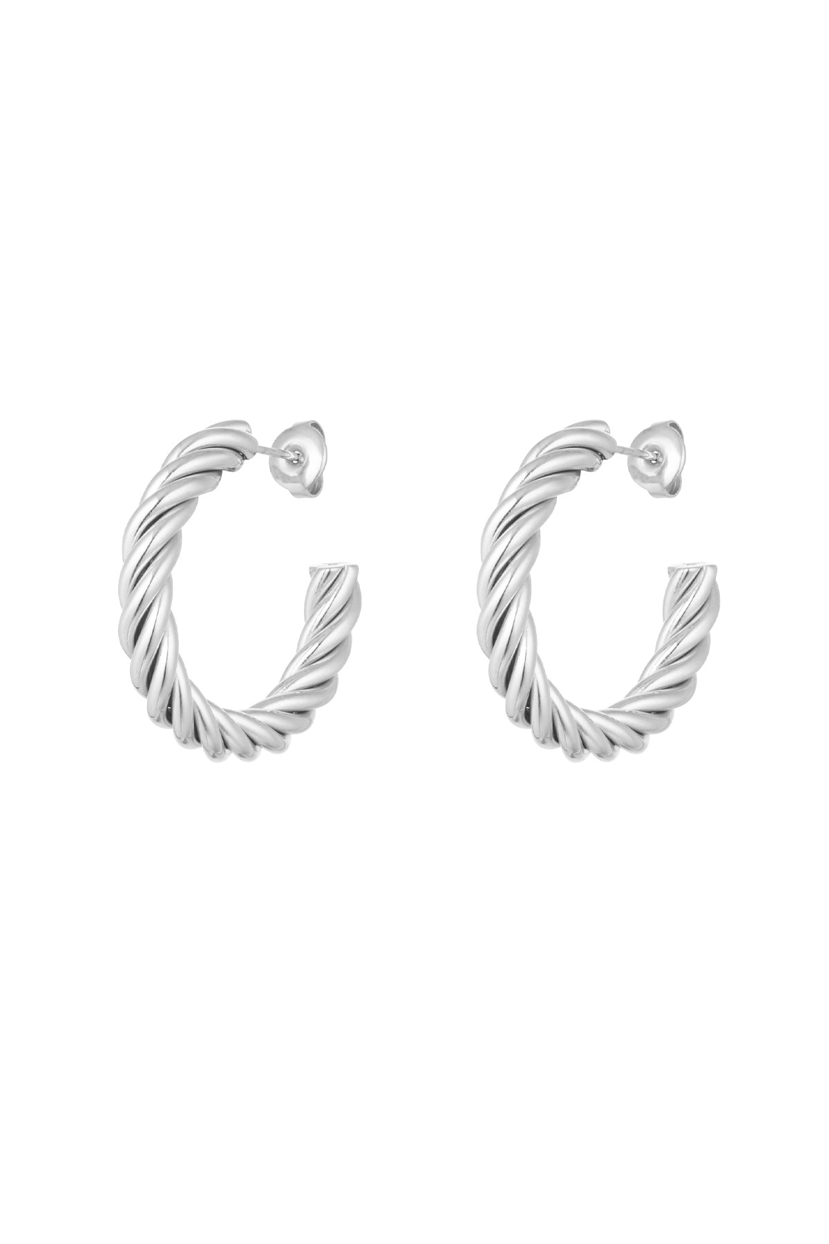 Čudoviti obročasti uhani v zaviti obliki. V srebrn barvi. Uhani so izdelani iz nerjavečega jekla in so veliki 3cm.