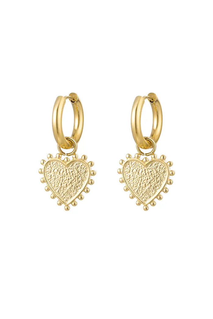 Zares kul in čudovit par okroglih uhanov z visečimi srčki. Srčki so dodatno okrašeni z kroglicami. V zlati barvi. Uhani so odlični za prihajajočo sezono. Izdelani iz nerjavečega jekla in v velikosti 3,5 cm.