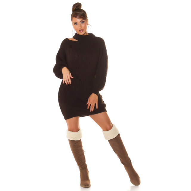 Elegantna pletena obleka z dolgimi rokavi. V moderni temno rjavi barvi. Univerzalna velikost (XS-M). Material: 100% akril. Pranje pri 30 stopinjah. Tabela velikosti- univerzalna velikostobseg prsi v cm: 74-89 cmobseg pasu v cm: 60-73 cmobseg bokov: 84-98 cm