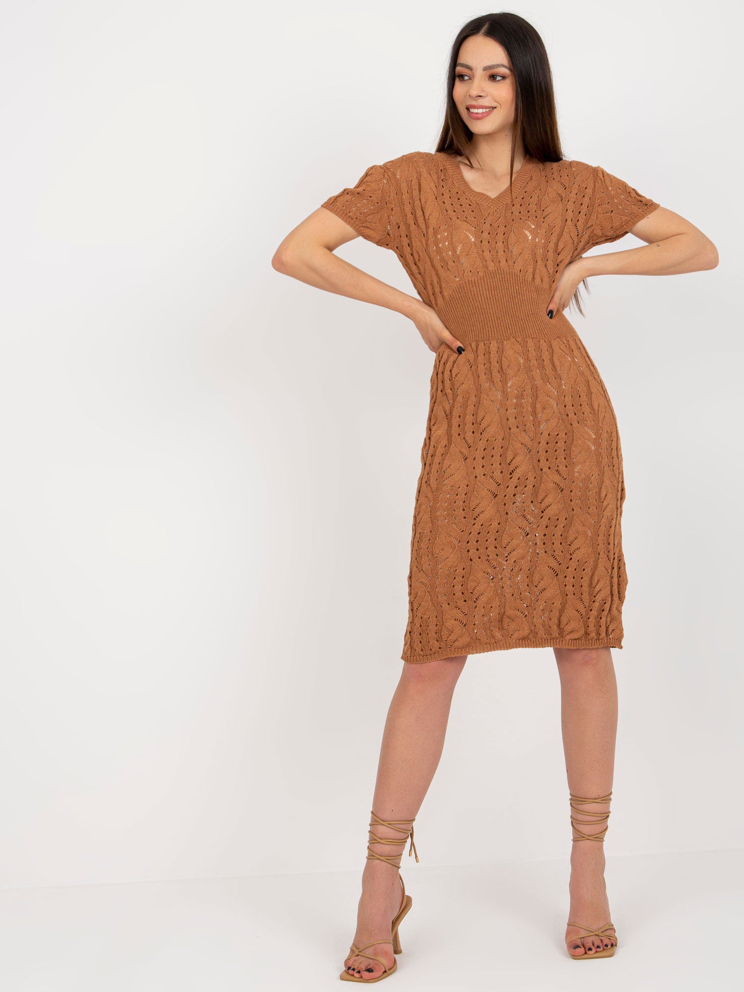 Pletena obleka iz udobnega materiala, ki se krasno poda vašemu telesu in je primerna za vse priložnosti. Odlični kompromis med eleganco in zapeljivostjo. Obleka v svetlo rjavi barvi, z vzorcem in V izrezom. Univerzalna velikost (XS-M). Pranje pri 30 stopinjah. Material: 60% bombaž, 40% poliester. Tabela velikosti- univerzalna velikostobseg prsi v cm: 74-89 cmobseg pasu v cm: 60-73 cmobseg bokov: 84-98 cm