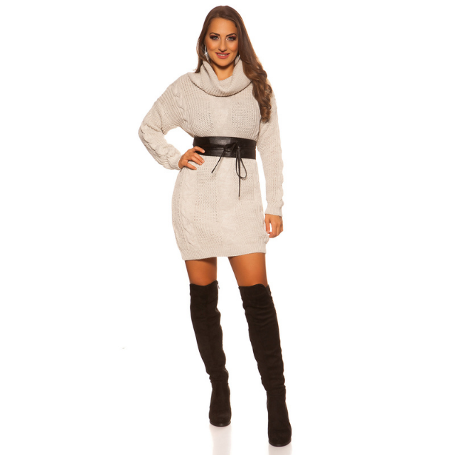 Elegantna pletena obleka z dolgimi rokavi, v sivi barvi. Srednje dolžine in primerna za vse dogodke. Univerzalna velikost (XS-M). Material: 100% akril. Pranje pri 30 stopinjah. Tabela velikosti- univerzalna velikostobseg prsi v cm: 74-89 cmobseg pasu v cm: 60-73 cmobseg bokov: 84-98 cm