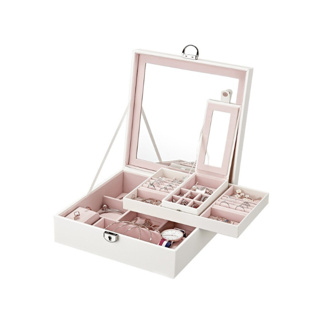 premišljeno zasnovana škatla za nakit, razdeljena na predelke kamor lahko shranite ogromno vašega  nakita. sestavljena iz kakovostnih materialov. zaradi svojega videza tudi kot dekorativni element vašega prostora.