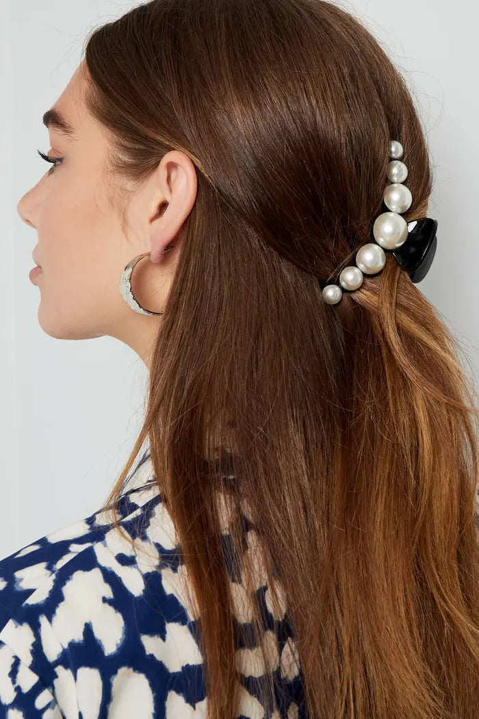 Čudovita in moderna sponka za lase s katero boste ustvarile graciozen videz. Sponka je v črni barvi in vsebuje 5 velikih, belih okrasnih biserov. V črno-beli barvni kombinaciji še bolj elegantna.  Narejena je iz plastike in v velikost meri 7 cm.