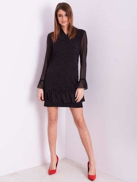 Kratka večerna  obleka v črni barvi. Z dolgimi rokavi in nežnim vzorcem vrtnice. Univerzalna velikost (XS-M). Material: 60% viskoza, 35% poliester, 5% elastan. Pranje pri 30 stopinjah. Tabela velikosti- univerzalna velikostobseg prsi v cm: 74-89 cmobseg pasu v cm: 60-73 cmobseg bokov: 84-98 cm
