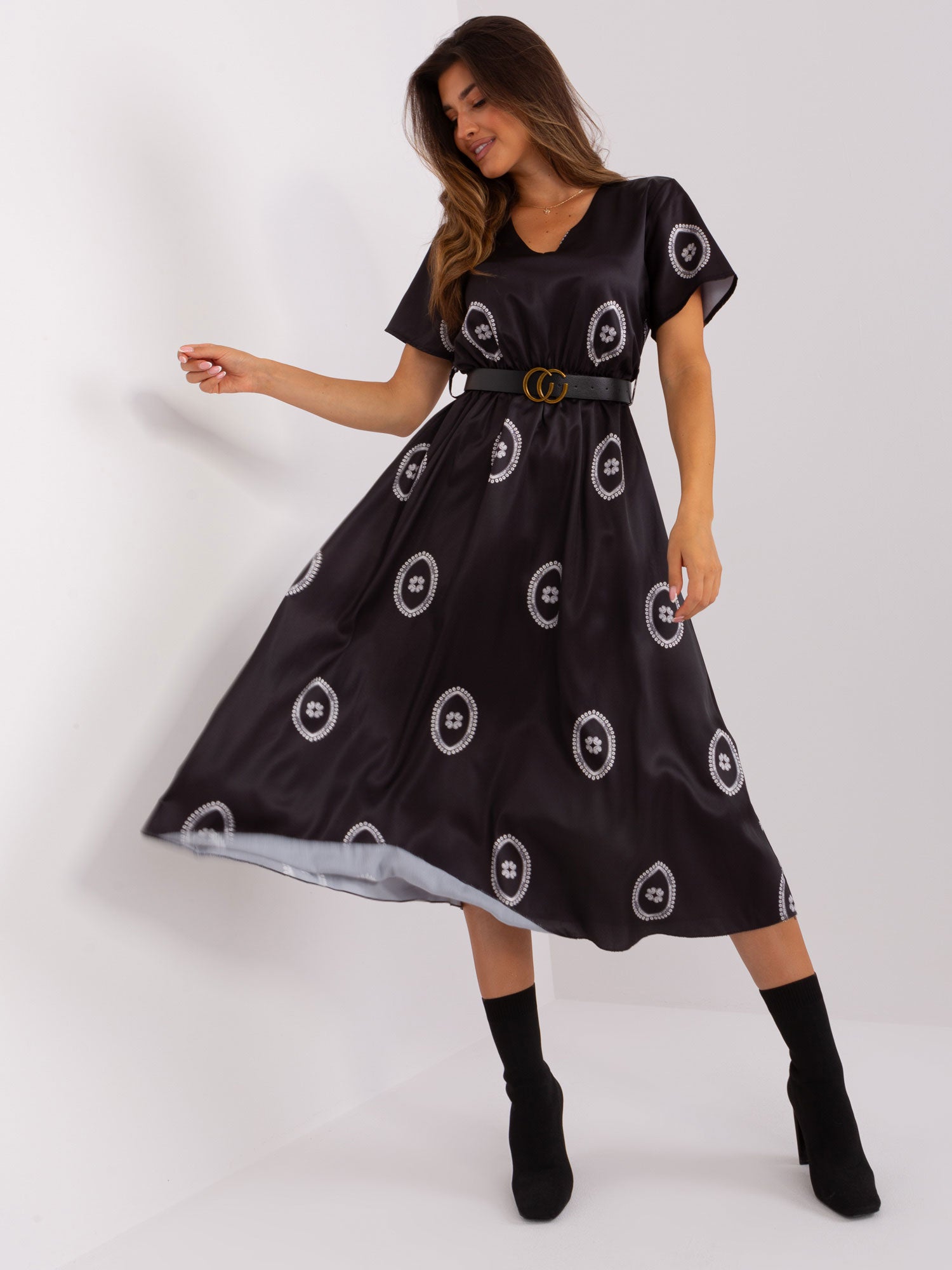 Elegantna večerna obleka v črni barvi z belim vzorcem in paščkom.  Elegantna "coctail" obleka, srednje dolžine, primerna za različne priložnosti. Univerzalna velikost (XS-M). Pranje pri 30 stopinjah. Material: 95% poliester, 5% elastan. Tabela velikosti- univerzalna velikostobseg prsi v cm: 74-89 cmobseg pasu v cm: 60-73 cmobseg bokov: 84-98 cm