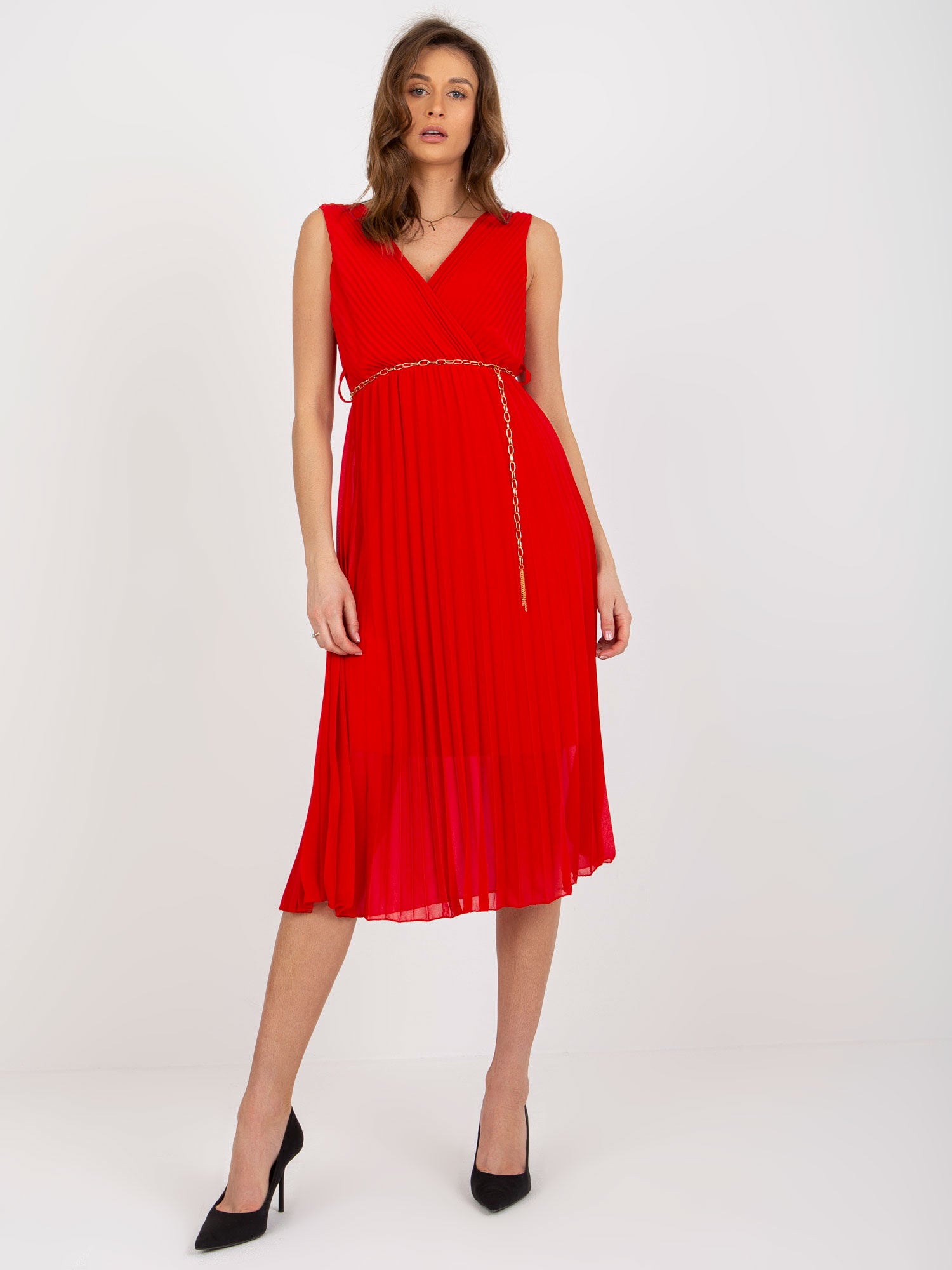 Elegantna večerna obleka, srednje dolžine v rdeči barvi. Rahlo naguban kroj, italijanskega dizajna z kovinskim paščkom v zlati barvi. Odlično se poda vsem posebnim priložnostim, zabavam, tudi porokam. Univerzalna velikost (XS-M). Pranje pri 30 stopinjah. Material: 50% poliester, 45% viskoza, 5% elastan. Tabela velikosti- univerzalna velikostobseg prsi v cm: 74-89 cmobseg pasu v cm: 60-73 cmobseg bokov: 84-98 cm