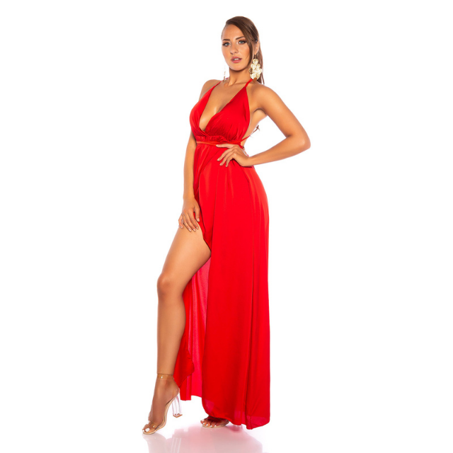 Čudovita dolga večerna obleka z razporkom, v rdeči barvi. Elegantna obleka, primerna tudi za svečane dogodke. Material: 100% poliester. Univerzalna velikost (XS-M). Pranje pri 30 stopinjah. Tabela velikosti- univerzalna velikostobseg prsi v cm: 74-89 cmobseg pasu v cm: 60-73 cmobseg bokov: 84-98 cm