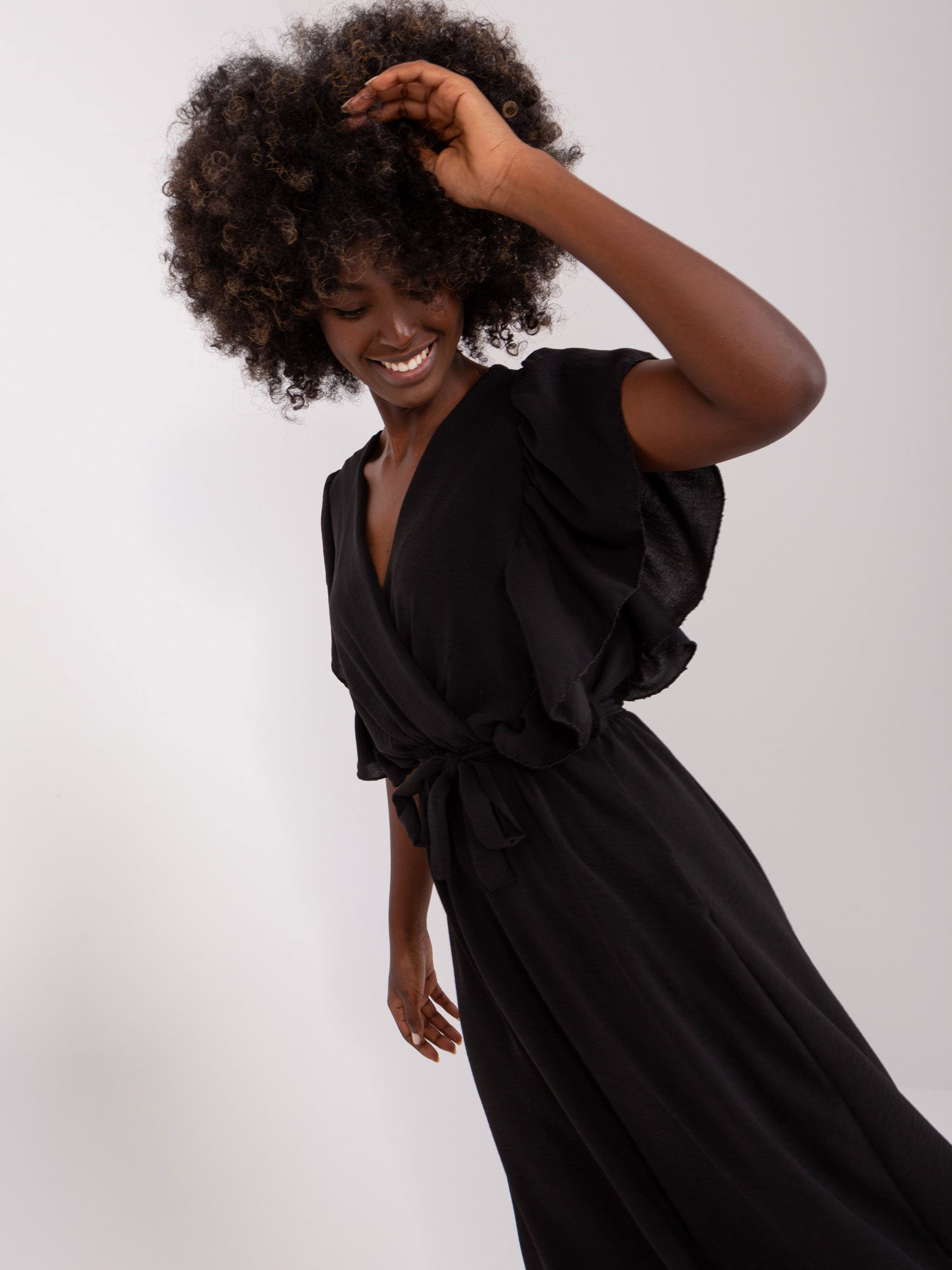 Prikupna ženska obleka, ohlapnega kroja in srednje dolžine. V vedno elegantni črni barvi, z dodatnim paščkom.  Univerzalna velikost (XS-M). Pranje pri 30 stopinjah. Material: 95% viskoza, 5% elastan. Tabela velikosti- univerzalna velikostobseg prsi v cm: 74-89 cmobseg pasu v cm: 60-73 cmobseg bokov: 84-98 cm
